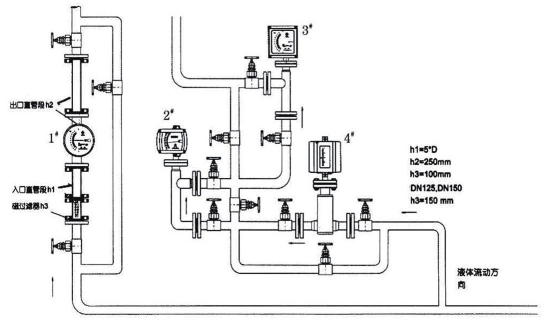 •仪表的上下游管道应与仪表的口径相同,连接法兰或螺纹应与仪表的法兰或螺纹匹配,仪表上游直管长度h应保证是仪表公称口径的5倍.下游直管段长度不少于250mm。